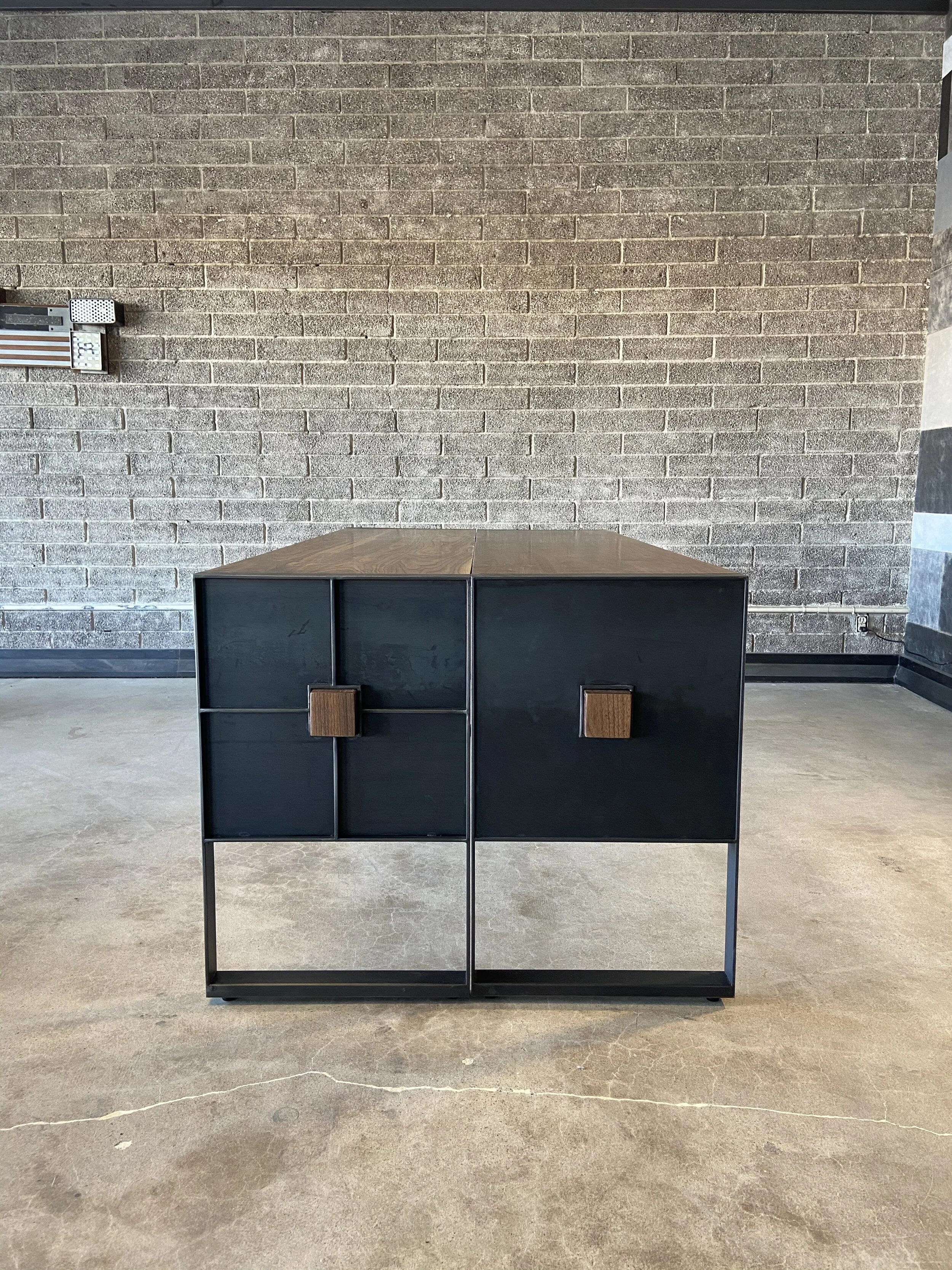 Modern desk that commands respect. Command center wrapped in sexy black walnut and flanked with black patina steel.